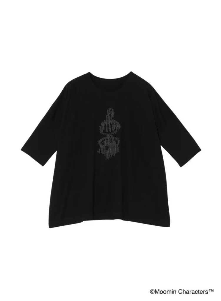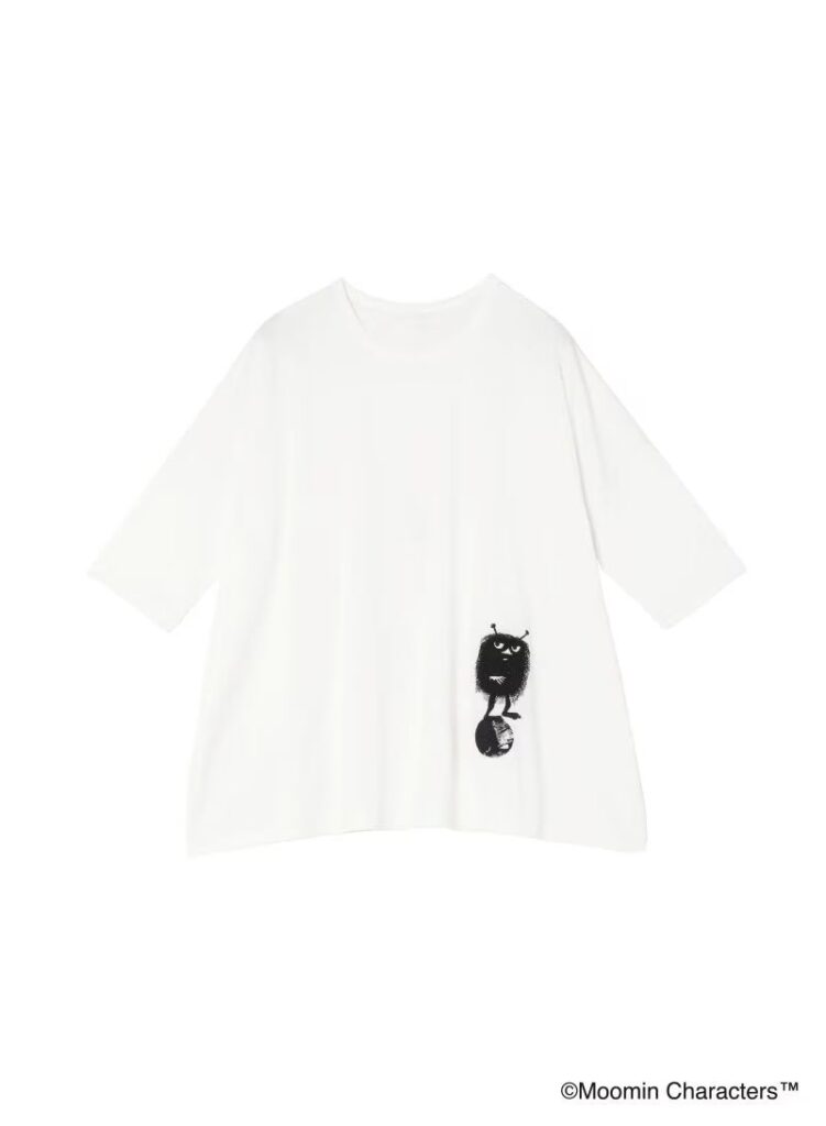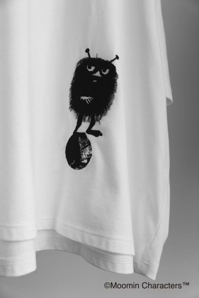 リトルミイの「後ろ姿」 をモチーフとして採用した、他では類を見ないデザイン。そして、スティンキーを大胆かつユーモラスに描いたモチーフを、Y’sの構築的なフォルムに載せることで、キャラクターの持つ遊び心とY’sの服作りの品格を美しく融合させている。
